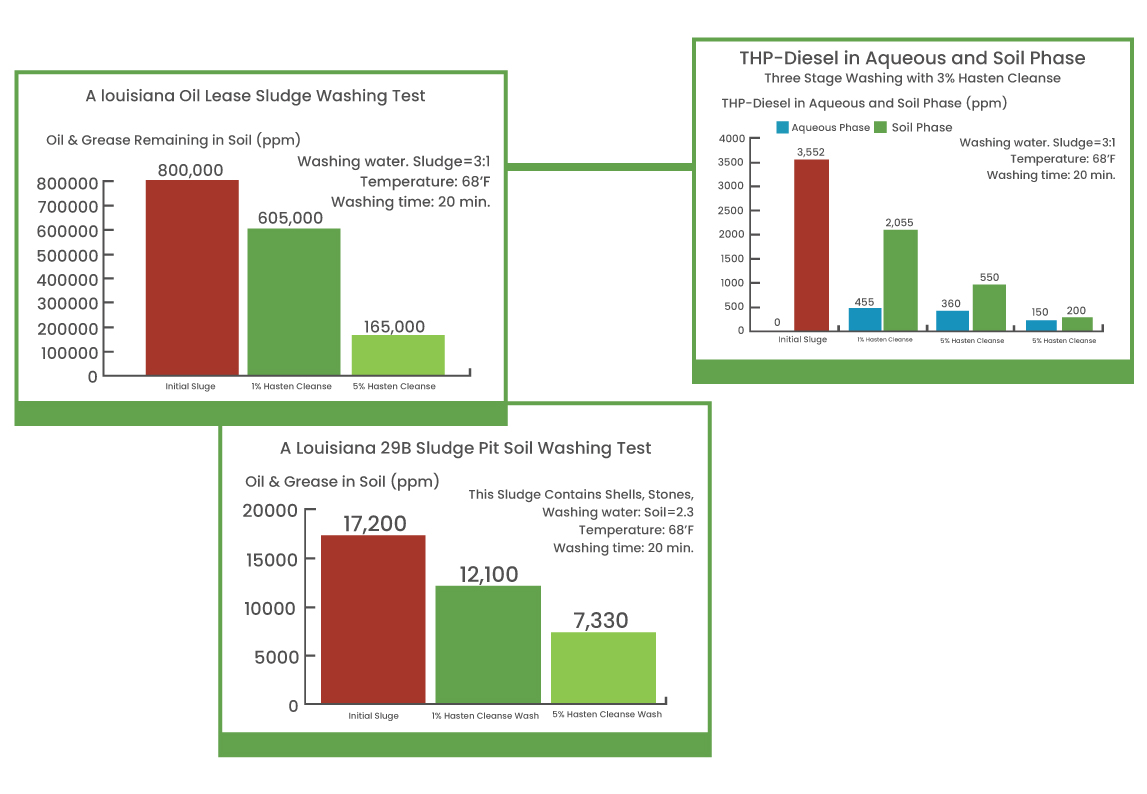 These three graphs represent actual soil remediation jobs done through the soil washing process. The graph on the right shows how the hydrocarbons that become emulsified in the water were reduced with the addition of Hasten Cleanse. Additional amounts of Hasten Cleanse added to the washwater will further reduce the levels of hydrocarbons.