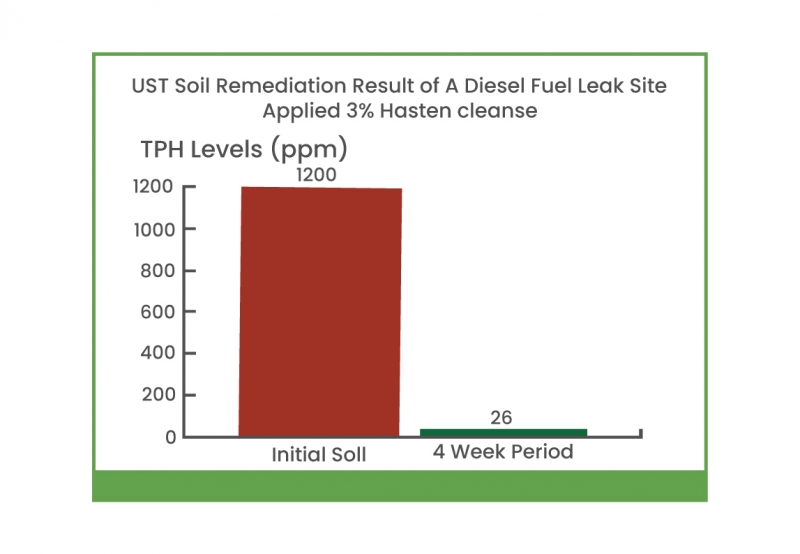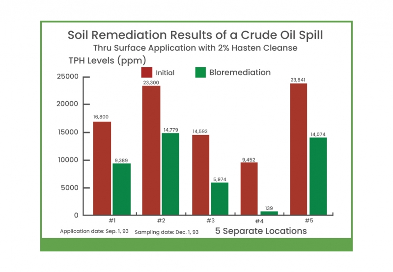Case studies have shown that Hasten Cleanse in prediluted solutions applied externally to the soil in a controlled fashion over a period of weeks, substantially lowered the levels of these hazardous components. The targeted hydrocarbons biodegrade and leave the soil in a correcting compliance mode. Additional applications render the soil cleaner than actually needed for mandated compliance. Bioremediation of hydrocarbon contaminants is now the most cost effective remediation practice for levels of hydrocarbons typically encountered in incidental spill scenarios